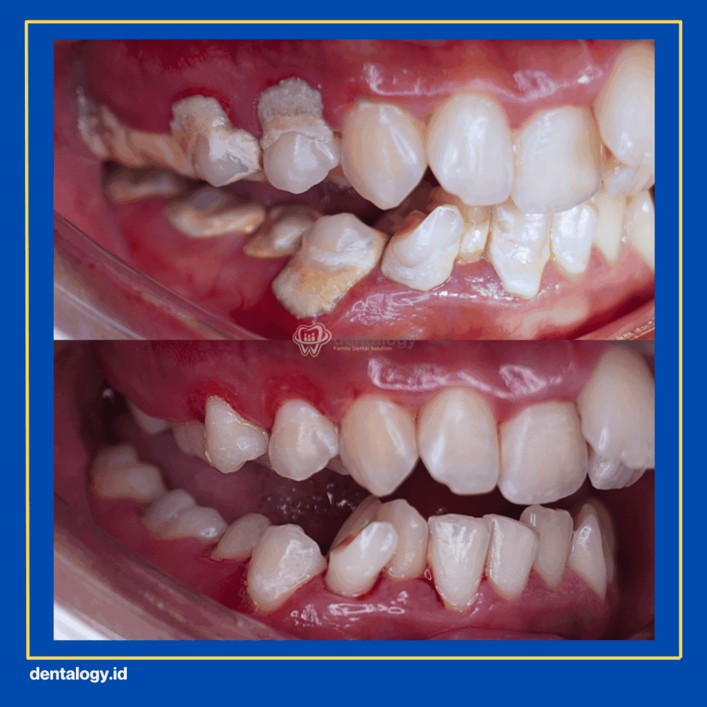 Setelah itu akan dipasang mahkota gigi untuk melindungi agar tidak mudah patah. Jika gigi tidak bisa diperbaiki, lakukan pencabutan dan segera pasang implan atau bridge agar gigi lain tidak bergeser.